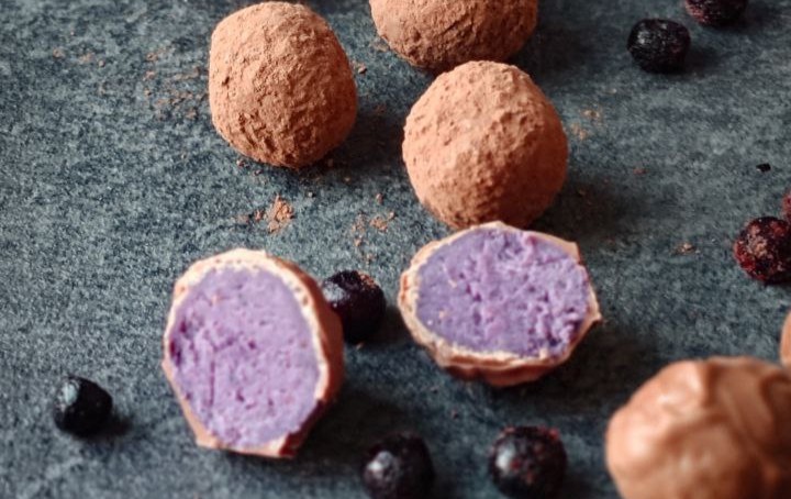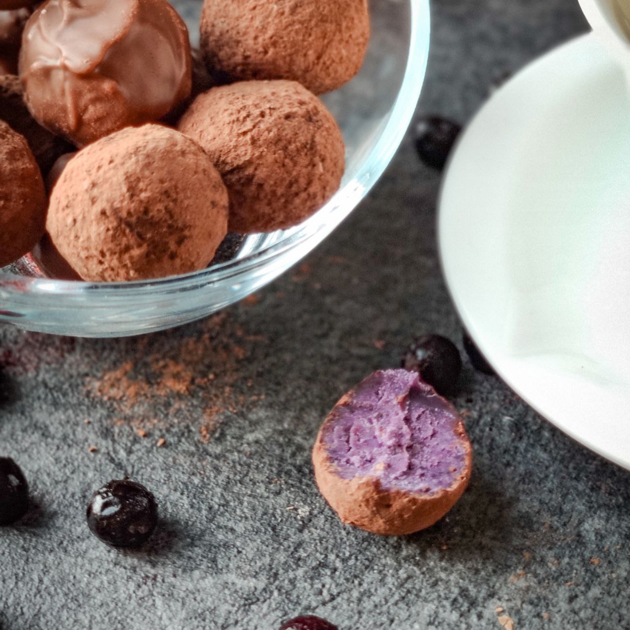 Черника оттеняет терпкость "голубого" сыра, добавляя во вкус свежие травяные нотки, а также придает трюфелям просто потрясающий цвет.