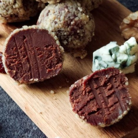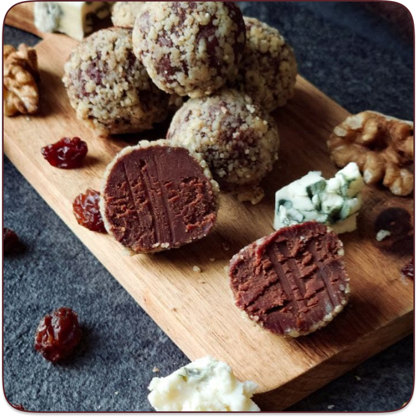 Тёмный шоколад с добавлением изюма, тонкая нотка коньяка, яркий вкус сыра с голубой плесенью и всё это в обрамлении крошки из грецких орехов.