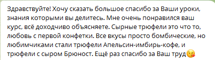 За 4 недели вы освоите техники темперирования шоколада, научитесь готовить сырные трюфели для себя или на заказ, которые хранятся до 2-х месяцев.